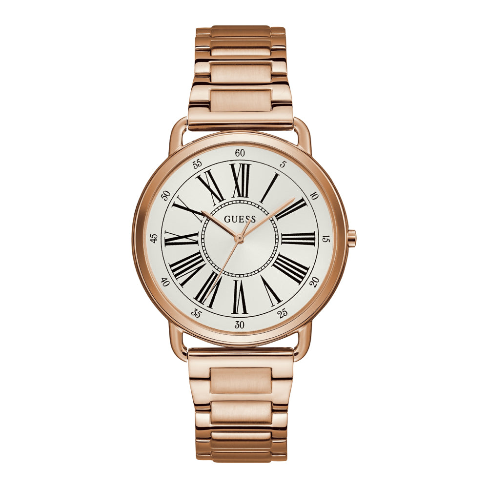 - Edelstahlgehäuse, rosegoldfarbene Beschichtung, poliert