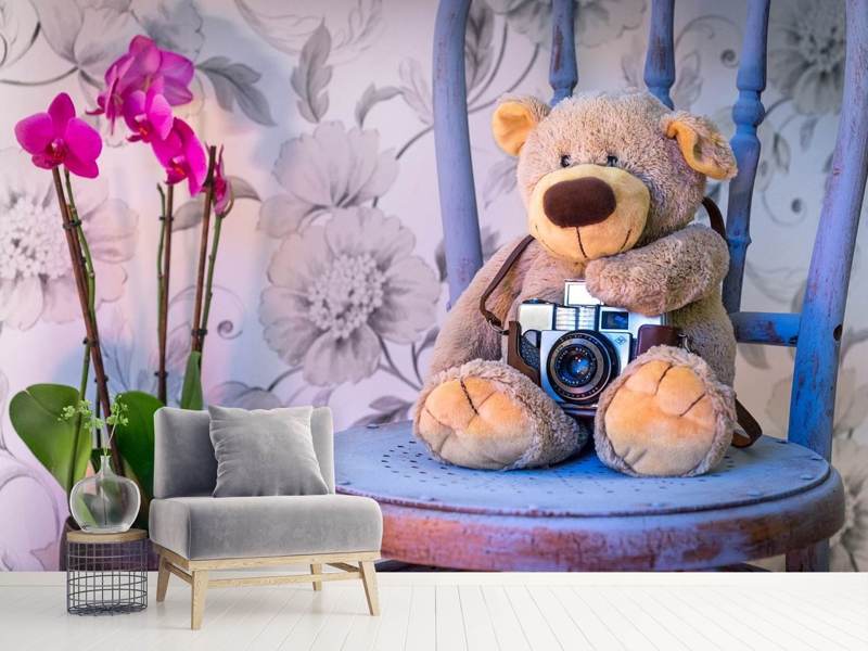 #teddybär #kamera #orchideen #szene #stuhl #kreide #malen #bär #teddy #spielzeug #kind #jung #niedlich #suchen #foto #fotografie #sitzen #stofftier #dekorativ #innenraum #kinderzimmer #glücklich #weiblich #lebensstil #liebe #spaß #kindheit #familie #tochter #lächelnd #pflanze