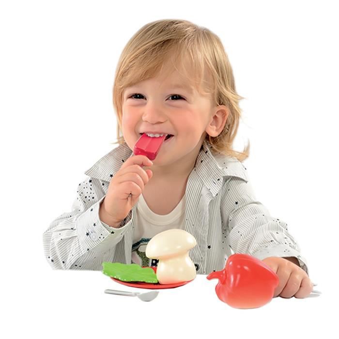 Eine solide und praktische Aufbewahrungsbox mit 75 Zubehörteilen zum Spielen von Essecken, darunter Waffeln, Joghurt, ein Glas Brotaufstrich, Dosen, Obst und Gemüse usw. Empfohlen für 18 Monate. Herkunft Frankreich Garantie.