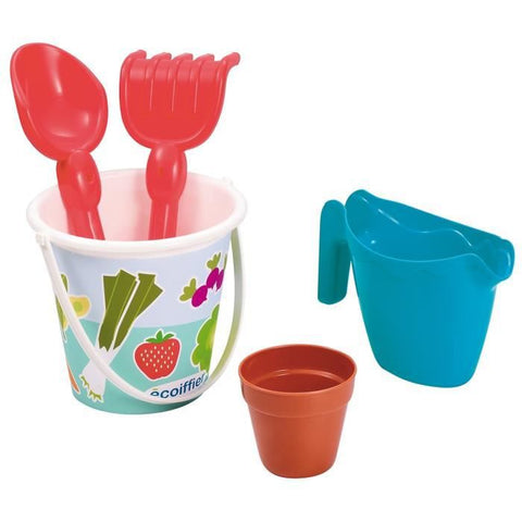 Ein Zugwagen, um einen dekorierten Eimer, eine Schaufel, einen Rechen, ein Sieb, eine Gießkanne und Sandschimmel in den Garten zu bringen. Empfohlen für 18 Monate. Herkunft Frankreich Garantie.